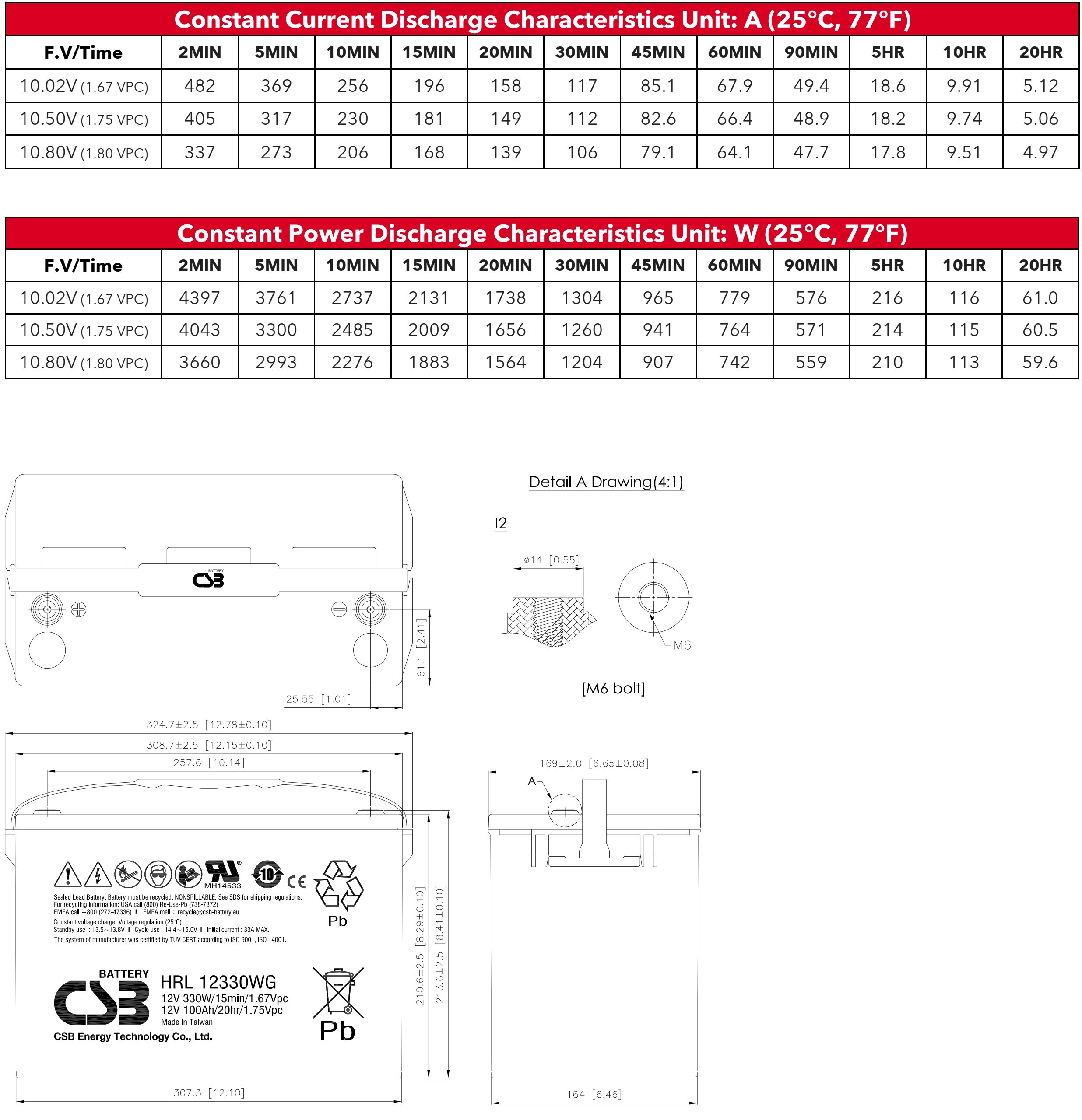 | Cycle Life | 6-12 Years | Length (L) (mm / in) | 324.7±2.5 / 12.78±0.10 |