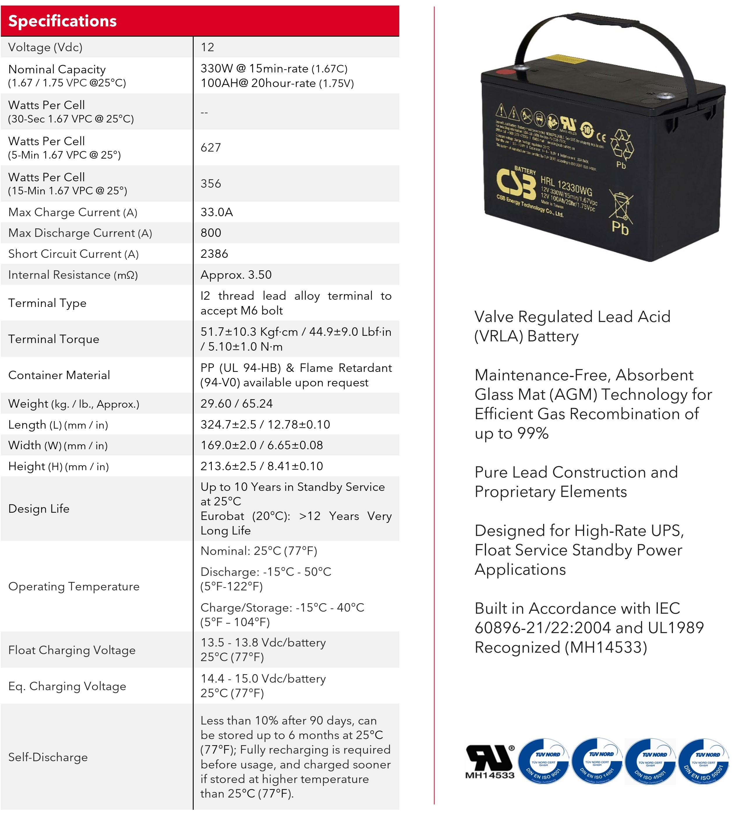 | Model Number | CSB HRL12330WG | Battery | 12V 330W |